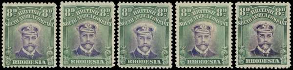 1913-7 8d Head Die II, perf 14, in slate-purple and grey-green. Five fine o.g. examples, this original printing not separated in Part 1. SG 230 var., AH 3 ('Very scarce')