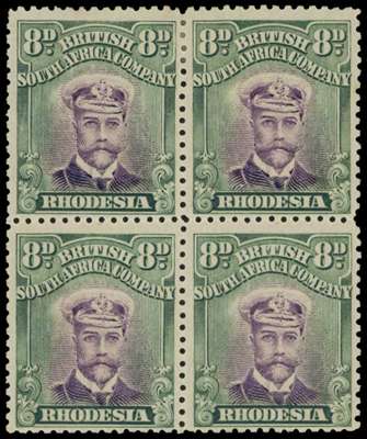 1913-7 8d Head Die II, perf 14. Block of four in dull purple and deep grey-green, part or large part o.g.; multiples are scarce. SG 230