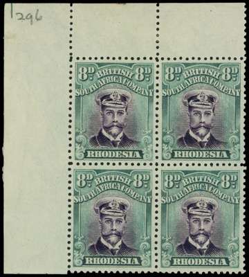 1922-4 8d Head Die IIIB, perf 14, white paper. Top left corner block of four in blackish purple and dull blue-green, crackly o.g., with adhesions on the selvedge but the stamps seemingly unmounted; fine. SG 296, AH 10