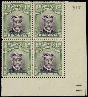 1923 8d Head Die IIIB, perf 15, white paper. Lower right corner block of four in blackish lilac and grey-green, large part (crackly) o.g. with a darker patch across the lower two stamps, with sheet number 11. SG 315, AH 11b