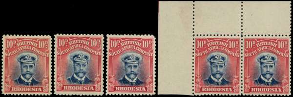 1913-7 10d Head Die II, perf 14. Five fine o.g. examples, shades, including a top left corner pair unmounted. SG 231, AH 1