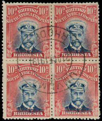 1913-17 10d Head Die II, perf 45. Used block of four from Plate 5 State 2, in steel-blue and rose-carmine, Umvuma CDS of 21 Oct 19. R4-6/1-2, showing King's left shoulder doubled on all four stamps; scarce shade. Ex Gibbs. SG 231 group, AH 7