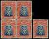 1918-21 10d Head Die IIIB, perf 14, toned paper. Unmounted o.g. block of four in Prussian blue and vermilion, ex County and Baillie; and a single with large part o.g., with R4/7 printer's mark at top. SG 270, AH 8(A)