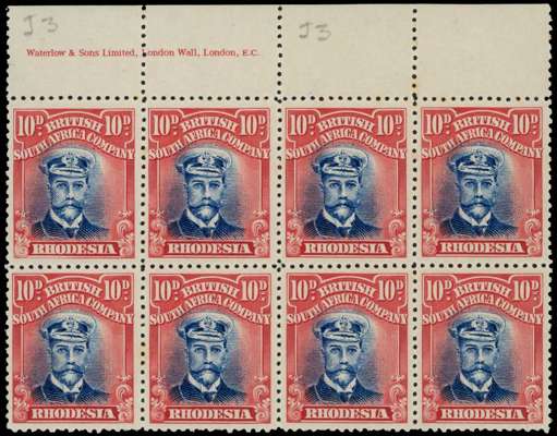 1918-21 10d Head Die IIIB, perf 14, white paper. Top marginal imprint block of eight in dull ultramarine and scarlet-vermilion, unmounted o.g. Perfs at base a little ragged but still a fine block, ex Gibbs. SG 299, AH 12a