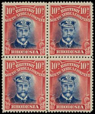 1922-4 10d Head Die IIIB, perf 15, white paper. Unmounted o.g. block of four in dull ultramarine and scarlet-vermilion. Usual crackled gum. SG 316, AH 12b