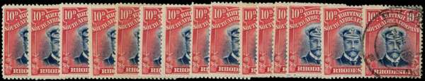 1913-7 10d Head Die II, perf 15. Fourteen mint examples, shades of indigo-blue and carmine-red, mainly fine, one with R3/7 printer's mark, and a fine used example. SG 247