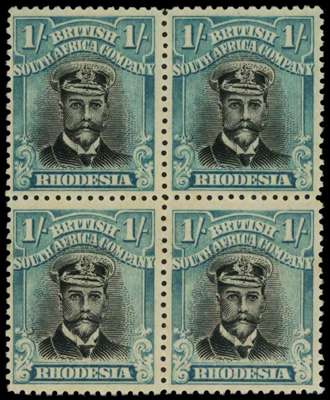 1918-21 1/- Head Die IIIB, perf 14, toned paper. Mint block of four in grey-black and deep turquoise-blue, o.g., lightly hinged on top pair only; fulsome colour. Ex Montgomery and Steinberg. SG 271, AH 10