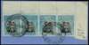1922-4 1/- Head Die IIIB, perf 14, white paper. Horizontal corner strip of four in black and dull blue, R1/10 collar flaw (selvedge signed Gibbs to that effect), Livingstone CDSs; some suffusion, not affecting the variety stamp. Scarce multiple. SG 300 var, AH 13