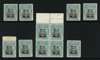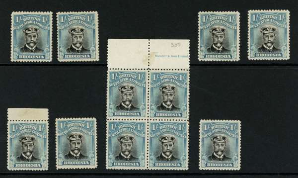 1922-3 1/- Head Die IIIB, perf 14, white paper. Seven singles and a part imprint block of four in black and deep turquoise-blue, the block with rather two-toned gum but of excellent appearance. SG 300, AH 14