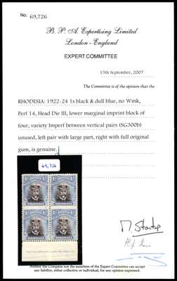 1922-4 1/- Head Die IIIB, perf 14, white paper. Mint lower marginal imprint block of four, two vertical pairs each imperforate between; the left pair with one stamp large part o.g., the right pair unmounted o.g. The selvedge lightly creased below the imprint, and a tiny mark between the left stamps, otherwise very fine. A splendid multiple, containing two of the ten possible pairs, a key Admiral and British Africa rarity. Ex County and Vestey (front cover illustration in both sales), BPA Certificate (2007). SG 300b, AH 16 Var