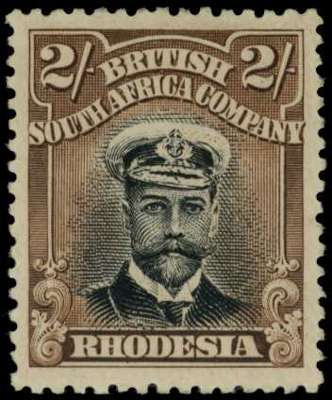 1913-17 2/- Head Die I, perf 14. Part o.g. example in black and deep brown, showing R3/2 sloping line, thin line of glazing on reverse at right. SG 214, AH 1
