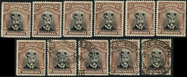 1922-3 2/- Head Die IIIB, perf 14, white paper. Seven fine o.g. examples in (sharp) black and reddish brown, generally fine, and four good used examples. SG 301, AH 16a