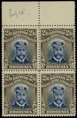 1913-7 2/6d Head Die II, perf 15. A very fine unmounted o.g. top marginal block of four in indigo and (paler) blackish brown. R1-2/7-8, each with beta flaw, R1/7 with 'comet' flaw. SG 249 group, AH 3b(B)