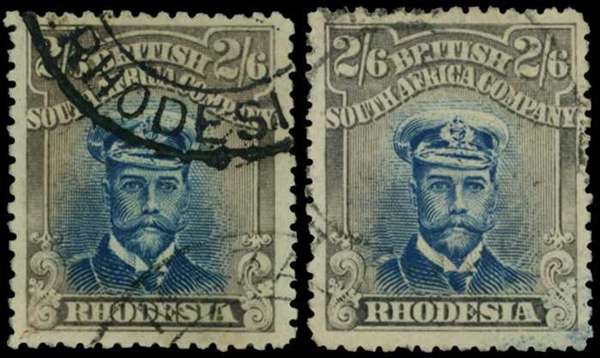 1917-20 2/6d Head Die IIIA, perf 14. Two used singles in the Handbook-listed variants of Prussian blue and drab, on toned and white papers, the white paper having a deeper and greyer frame. SG 255k, AH 7(A+B)