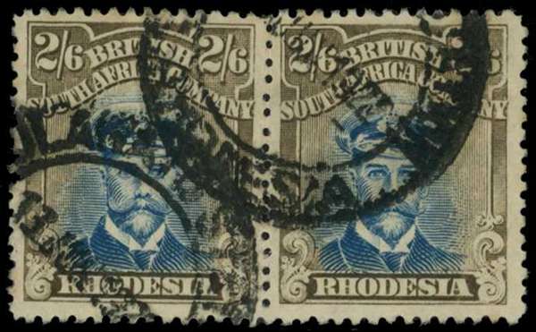 1918-21 2/6d Head Die IIIB, perf 14, toned paper. Used horizontal pair, Variant C in deep blue and bistre-brown, Bulawayo Station CDSs. Left stamp with dot on right collar wing. SG 274a, AH 8(C)
