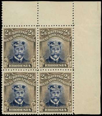 1922-3 2/6d Head Die IIIB, perf 14, white paper. Corner block of four from top right corner of the sheet in deep violet-blue and (light) sepia, R1-2/10 with collar flaws, fine o.g., unmounted save for hinge reinforcement across R1/10 and selvedge. A fine block, ex Shiloh, Baillie and Steinberg. SG 302, AH 12