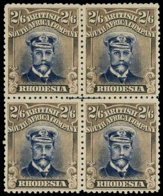 1922-3 2/6d Head Die IIIB, perf 14, white paper. Mint block of four, large part o.g. or unmounted, in deep violet-blue and (light) sepia. R3-4/3-4 printer's mark in centre. SG 302, AH 12