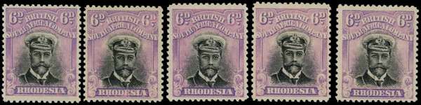 1913-7 6d Head Die II, perf 14. Five mint examples in black and deep mauve, good shades, fine large part o.g. SG 228, AH 12(A)