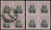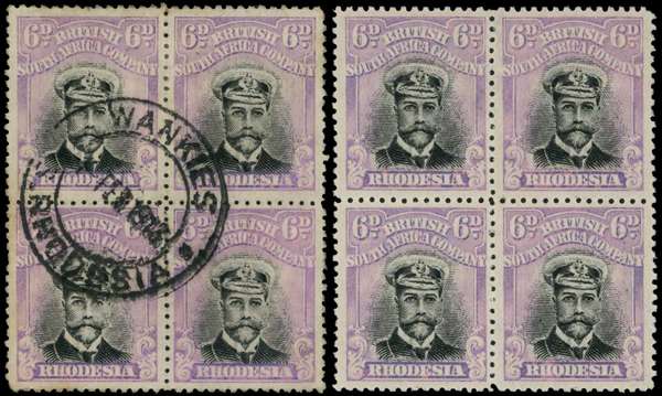 1913-7 6d Head Die II, perf 14. Used block of four in grey-black and reddish purple with Wankies CDS, and large part o.g. block in grey-black and bluish deep mauve; the latter ex Gibbs, Baillie and Steinberg. SG 228 group, AH 14(B) and (C) respectively