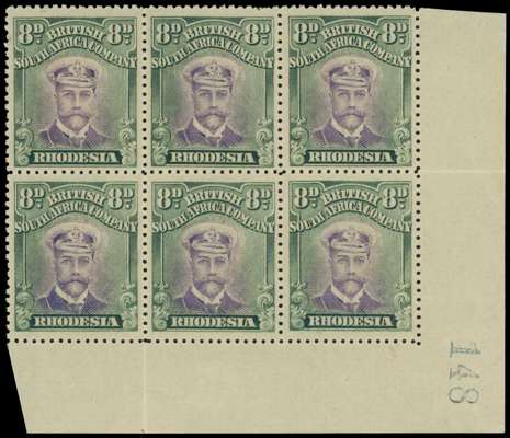 1913-7 8d Head Die II, perf 15. Lower right corner block of six with sheet number 148, folded horizontally and vertically, the stamps unmounted. Top centre stamp with a couple of short perfs, but with very good colour, a rare positional piece. SG 246, AH 4b