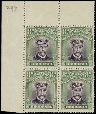 1922-4 8d Head Die IIIB, perf 14, white paper. Top left corner block of four in blackish lilac and grey-green, (crackly) o.g. with a darker patch across the top two stamps, hinged on the selvedge only. Selvedge bend and some short perfs in places. SG 297, AH 11a