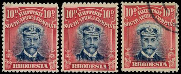 1913-7 10d Head Die II, perf 14. Two o.g. examples plus one used in deep blue and scarlet-vermilion, from Plate 1R-EP early State, the used example with long printer's mark (proving the printing). Very scarce. SG 231 group, AH 4