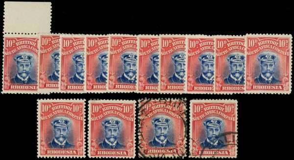 1922-4 10d Head Die IIIB, perf 14, white paper. Twelve mint examples with varying amounts of o.g., one with collar flaw and two with printer's marks; and two used, one with printer's mark and the other with R1/6 dots on collar wing tip. SG 298, AH 11
