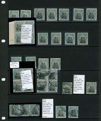 1913-7 1/- Head Die II, perf 14. Fine range on Hagner sheet with nineteen mint (including a block of four), varying amounts of o.g., and fifteen used including two blocks of four and a strip of three. Good shades. SG 233, AH 1
