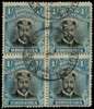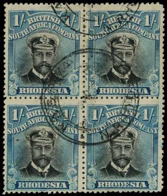1913-9 1/- Head Die II, perf 15. Used block of four with Kasama CDS (Proud D4), a little colour run at right barely affecting appearance. SG 248, AH 3