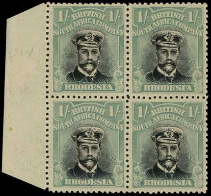1918-21 1/- Head Die IIIB, perf 14, toned paper. Unmounted o.g. left marginal block of four in black and (greener) dull blue-green, a splendid block and rare as such. SG 272b, AH 4(A)