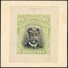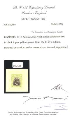 1913 10/- Die Proof in trial colours of black and pale yellow-green, 27 x 32mm mounted on card 38mm square. Horizontally scored, as usual. Rare. BPA Certificate (2012). For SG 241
