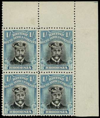 1922-4 1/- Head Die IIIB, perf 14, white paper. Mint top right corner block of four in (pale) grey-black and (deeper) pale blue, usual crackly gum with the stamps unmounted. No collar flaws. Folded between stamps and top selvedge. Ex Baillie and Steinberg. SG 300, AH 15a ('Scarce')