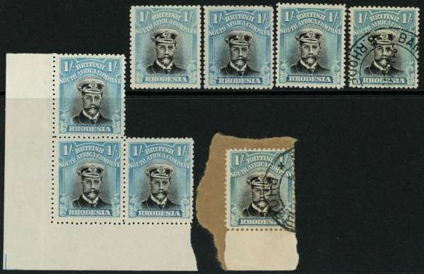 1922-3 1/- Head Die IIIB, perf 14, white paper. Plate 12 printing, 'scarce', six o.g. examples plus a corner 'block' of three, unmounted; and two used, one with R6/1 cap dot and other flaws. SG 300 group, AH 15a