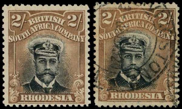 1913-7 2/- Head Die II, perf 14. Mint example from the black and yellow-brown group, variant (B) in grey-black and yellowish light brown. Fine o.g. with crackly gum. Also a fine used example. SG 235, AH 6(B)