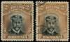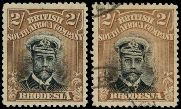 1913-7 2/- Head Die II, perf 14. Mint example from the black and yellow-brown group, variant (B) in grey-black and yellowish light brown. Fine o.g. with crackly gum. Also a fine used example with handpainting above the King's cap. SG 235, AH 6(B)