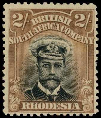 1913-7 2/- Head Die II, perf 14. Large part o.g. example in grey-black and yellowish light brown with cap smear from column 8, and showing handpainting above cap. Faint spotting on reverse. SG 235, AH 6(B)