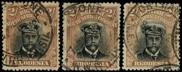 1917-20 2/- Head Die IIIA, perf 14. Three fine used examples, slight shades. SG 255j, AH 8
