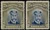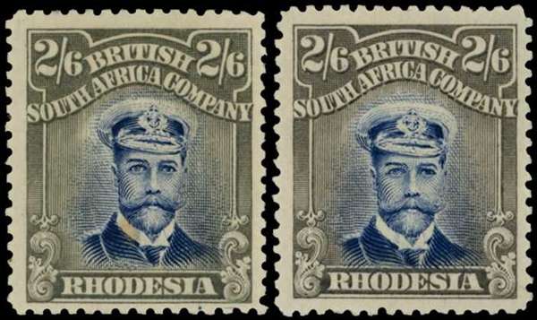 1913-7 2/6d Head Die II, perf 14. Two o.g. examples in chalky blue and brownish grey, one with R3/3 printer's mark (toned fleck on reverse) and the other with R5/1 intermediate BILCO re-entry, fine. SG 236 group, AH 1a