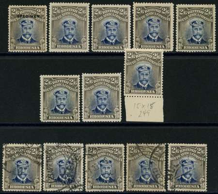 1913-7 2/6d Head Die II, perf 15. Eight mint examples in chalky blue and brownish grey, mainly fine, one with flaw on collar wing. Also five used examples, one with printer's mark. SG 249 group, AH 1b