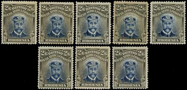 1913-7 2/6d Head Die II, perf 15. Eight mint examples in indigo and (paler) sepia blackish brown, one toned otherwise mainly fine; one with R1/7 comet flaw at top of cap, another ex Gibbs reference collection. SG 249 group, AH 3b(A)