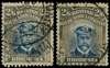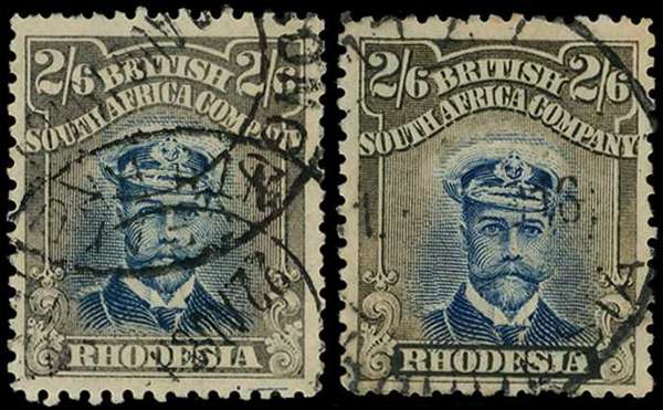 1913-7 2/6d Head Die II, perf 14. Two used examples from Plate 4 State 1, in steel-blue and blackish brown. One with R3/7 printer's mark, the other showing slight 'kiss' doubling of the frame, ex Kirkpatrick. SG 236 var, AH 4