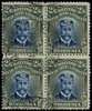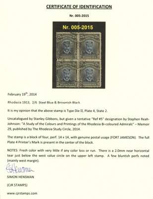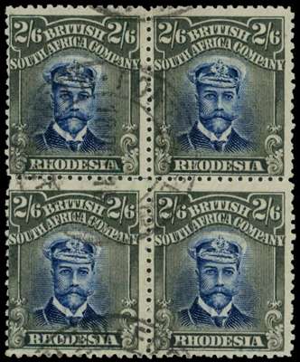 1913-7 2/6d Head Die II, perf 14. Used block of four in deep blue and brown-olive, Fort Jameson CDSs. Plate 4 printer's mark in the centre of the block. Minor defects, including a small tear affecting the upper left stamp, still a rare and striking multiple. Ex Kirkpatrick; Hensman Certificate (2014) as 'Steel Blue and Brownish Black'. SG 236ab, AH 5