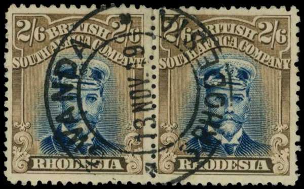 1918-21 2/6d Head Die IIIB, perf 14, toned paper. Used horizontal pair, Variant C in deep blue and bistre-brown, neat Gwanda CDS of 13 NOV 19. Attractive pair, albeit with a few nibbled perfs. SG 274a, AH 8(C)