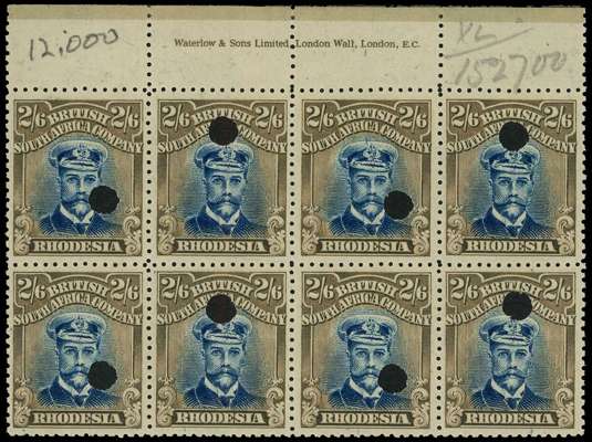 1918-21 2/6d Head Die IIIB, perf 14, toned paper. Top marginal imprint block of eight from the file sheet, small punctures, with gum. SG 274a, AH 8(C)