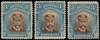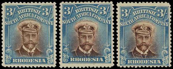 1913-7 3/- Head Die II, perf 14. Three large part o.g. examples from Plate 3 State 1, in shades of brown and turquoise-blue. SG 237, AH 1