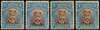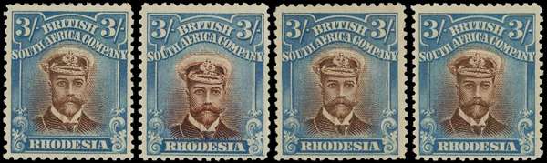 1913-7 3/- Head Die II, perf 14. Four part to large part o.g. examples from Plate 3 State 2, in shades of reddish brown and turquoise-blue. SG 237 group, AH 2