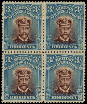1917-20 3/- Head Die IIIA, perf 14. Fine mint block of four in reddish brown and deep turquoise-blue, lightly hinged on the top pair with the lower pair unmounted o.g. A fine and scarce multiple. SG 255m, AH 6