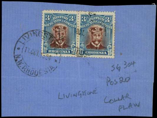 1922-4 3/- Head Die IIIB, perf 14, white paper. Fine used pair in reddish brown and greenish blue on blue piece, Livingstone CDSs of 11 OCT 24, right stamp with R2/10 collar flaw. SG 304, AH 9