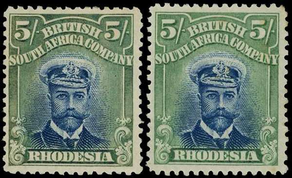 1913-7 5/- Head Die II, perf 14. Two part/large part o.g. examples in deep blue and dull green, good shades, fine.