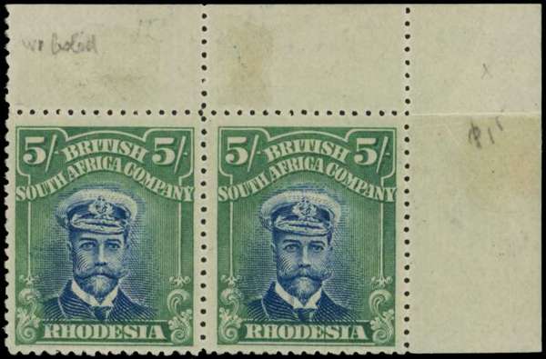 1913-7 5/- Head Die II, perf 15. Top right corner pair in deep blue and dull yellowish green, fine o.g. with the right stamp unmounted; folded between the stamps and top selvedge, hingemarks on front of selvedge. SG 251, AH 2